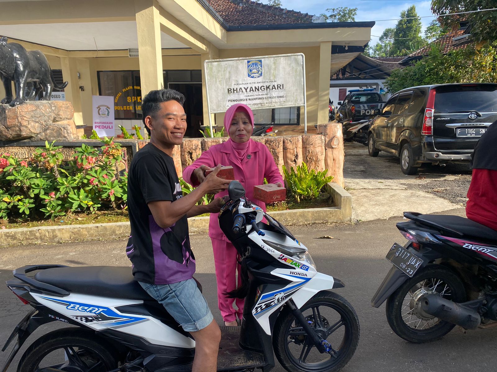 JABAR|PencanangNews.com-Bhanyangkari Beserta Personel Polsek Lengkong berbagi kepada pengemudi yang melintas di depan mako Polsek Lengkong. Senin (3/4/2023)