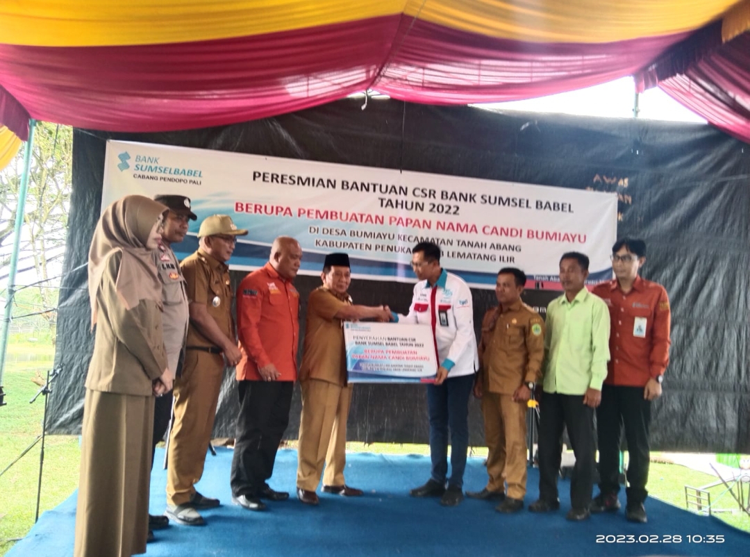 PALI|PencanangNews.com – Pihak Bank Sumsel Babel (BSB), gelar persemian penyaluran bantuan dalam Program Corporate Social Responsibility (CSR) Tahun 2022 Berupa pembuatan papan nama candi Bumi Ayu Kecamatan Tanah Abang, Kabupaten Penukal Abab Lematang Ilir (PALI) Provinsi Sumatera Selatan.