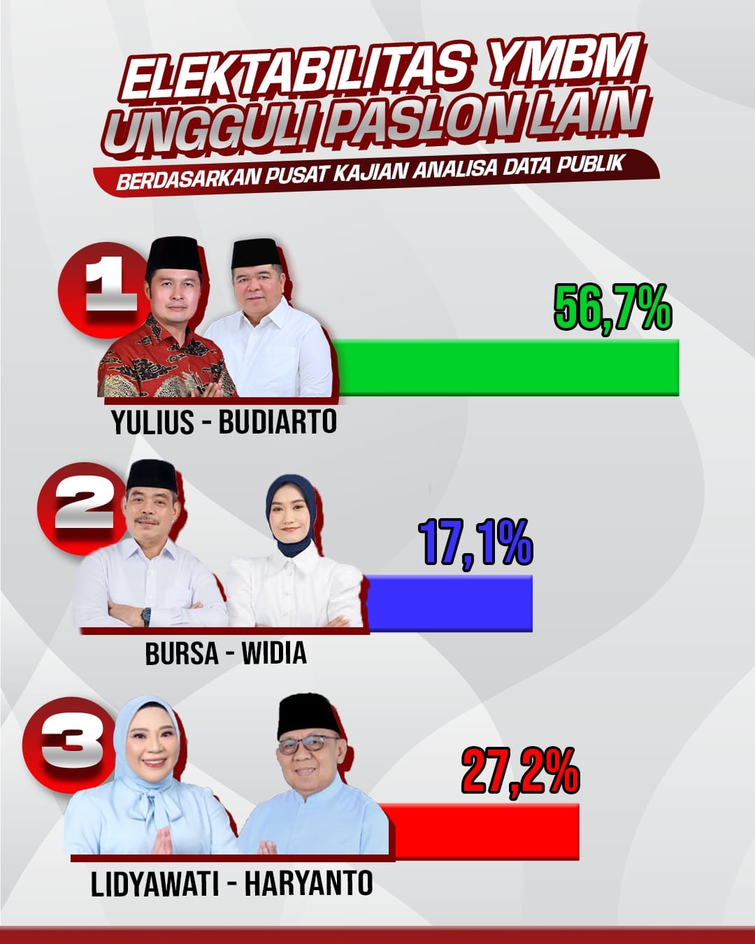 LAHAT|Pencanangnews.com-Jelang kontestasi Pemilihan Kepala Daerah (Pilkada) Lahat 2024, hasil survei terbaru menunjukkan persaingan ketat antar kandidat. Lembaga Survei Pusat Kajian Analisa Data Publik mengungkapkan bahwa Calon Kepala Daerah dengan segudang pengalaman, Yulius Maulana dan Budiarto, sementara ini memimpin dengan perolehan suara sebesar 56,7%, diikuti oleh pesaingnya, Lidyawati – Haryanto 27,2%, Bursa – Widia yang mendapatkan dukungan 17,1%.