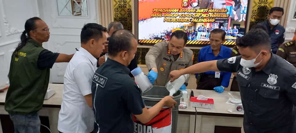 Kapolrestabes Palembang, Kombes Pol Harryo Sugihhartono didampingi Kasat Narkoba, AKBP Mario Ivanry dan Kasi Pidum Kejari Palembang Robert mengatakan, bahwa barang bukti yang di blender ini, merupakan ungkap kasus dari dua laporan polisi (LP).