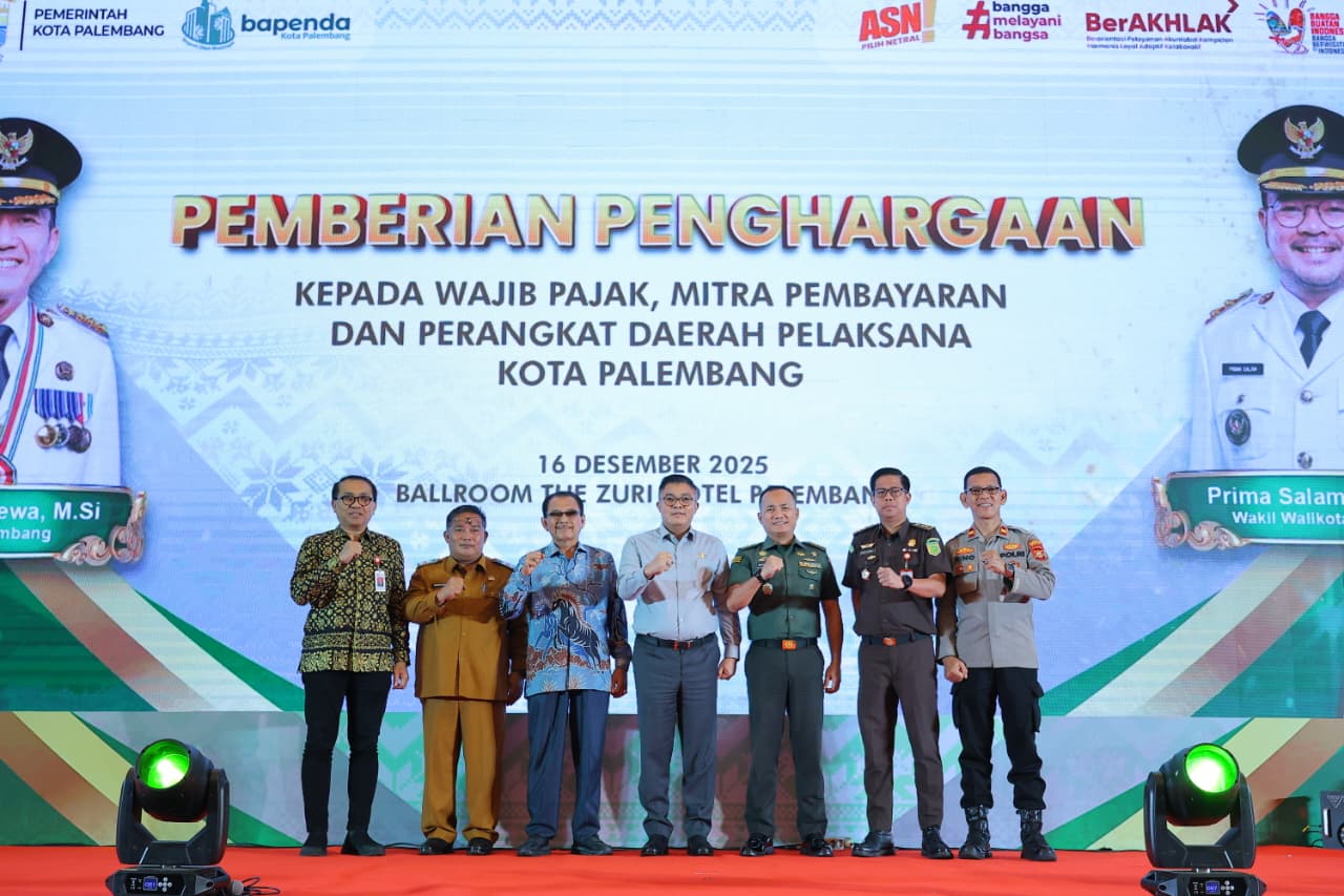 Palembang | Pencanangnews.com — Pemerintah Kota Palembang melalui Badan Pengelola Pendapatan Daerah (BAPENDA) Kota Palembang menggelar acara pemberian penghargaan kepada para Wajib Pajak, Mitra Pembayaran, serta Perangkat Daerah Pelaksana yang telah menunjukkan kontribusi luar biasa dalam mendukung optimalisasi penerimaan pajak daerah sepanjang tahun 2025.