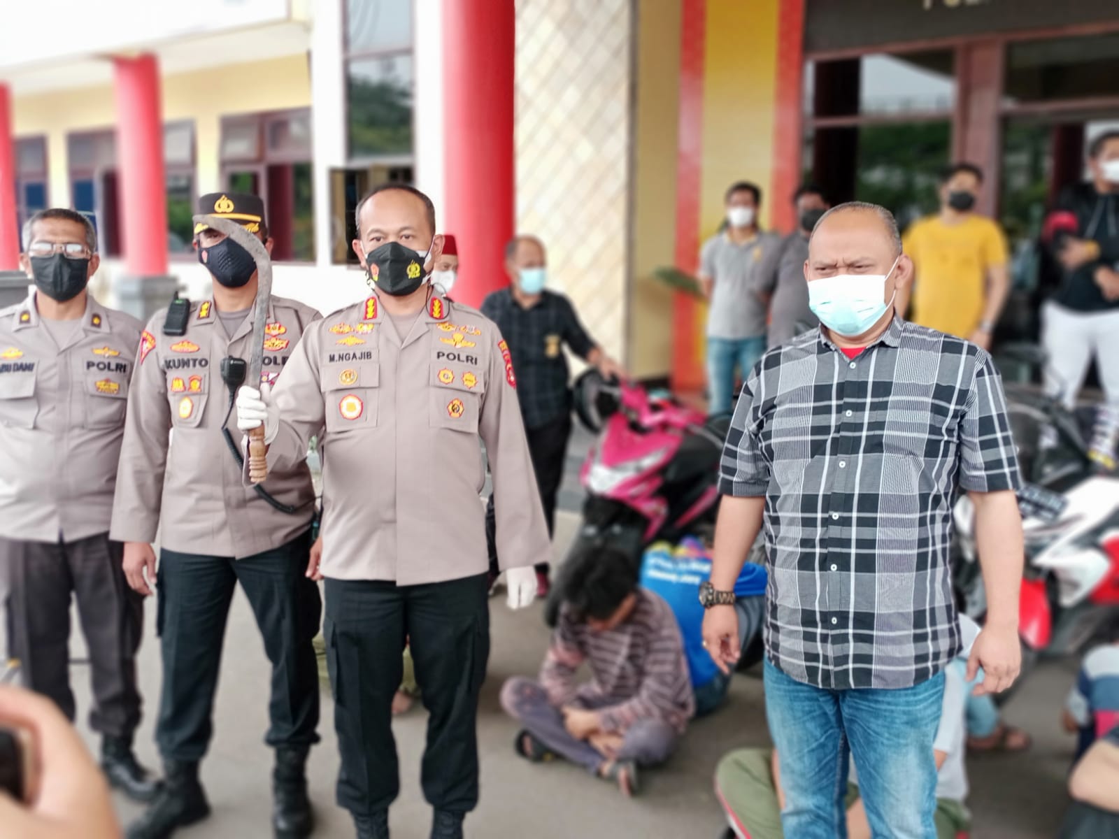 “Pada hari Minggu (6/2) malam ada kejadian dimana ada korban di bacok menggunakan celurit dan terluka ditangannya, setelah kita melakukan penyelidikan ternyata ada sekelompok remaja yang bergerombol yang melakukan kegiatan meresahkan masyarakat, lalu kita tangkap ada sembilan orang, dan salah satunya pelaku yang membacok menggunakan celurit untuk melukai korban,” jelas Kombes Pol Mokhamad Ngajib, saat diwawacara awak media, Kamis (10/2/2022) sore.