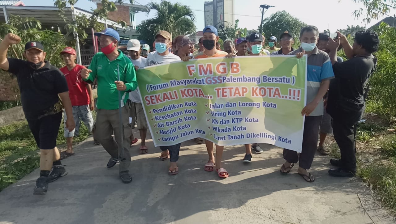 Dengan membentangkan spanduk, ratusan warga ini berjalan kaki mengelilingi Komplek Perumahan GSS. Hal ini dilakukan sebagai bentuk penolakan terhadap Kabupaten Banyuasin menjadi domisili mereka.